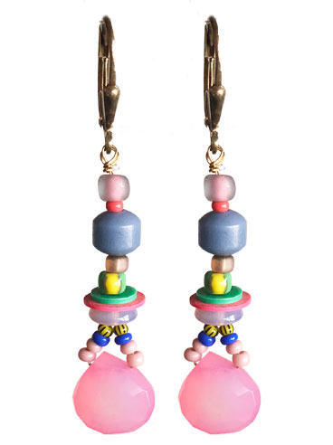 Zippy and colorful dangly two-tiered earrings made with faceted hot pink chalcedony, vintage glass with seed beads on sterling silver lever back earring fixtures. 2"L x .5"W