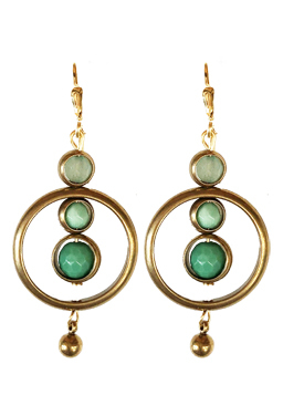 Clean design, easy to wear brass rings with faceted chrysoprase and dyed new jade beads with a brass ball dangle on 22K vermeil lever back earring backs.