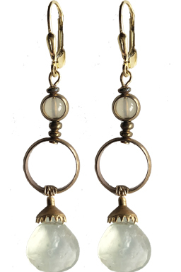 Faceted prehnite doublets with prehnite (pale jade) accents and brass beads on 22K vermeil lever back fixtures.