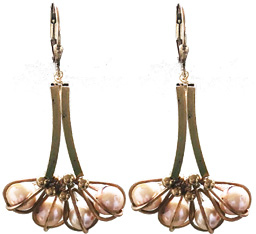 Elegant modern art deco design with vintage and new brass findings with champagne colored freshwater pearls on 22K vermeil lever back earring fixtures. 2"Long x 1.25"Wide