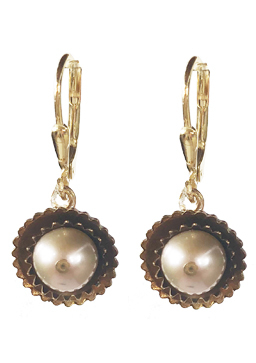 Champagne colored freshwater pearls inside vintage brass cups on 22K vermeil lever back earring fixtures.
