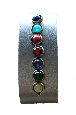 Unisex bracelet with assorted rainbow colored glass and semiprecious beads with new brass rings on 1" wide silver leather cuff with brass snaps adjusts to 2 different sizes to fit most sized wrists.