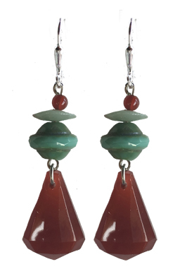Fancy green solar looking beads with carnelian and aventurine with 1930's carnelian glass drops on sterling silver lever back earring fixtures.