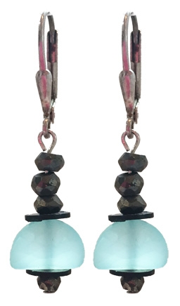 Faceted aqua chalcedony and pyrite beads on sterling silver lever back earring fixtures. 1"L x .3"W