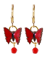 1950's French enamel butterflies in tomato red with 1940's glass drops on 22K vermeil lever back earring fixtures. 1.2"L x .5"W