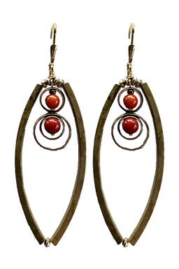 Modern brass hoops and rings with coral beads on 22K vermeil lever back earring fixtures.