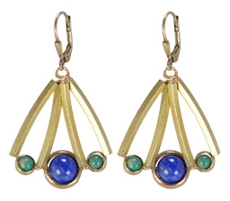 Modern brass in a fan shape with encased accents of amazonite with lapis center beads. 1.5"W x 2"L