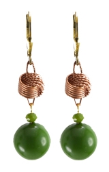 Vintage copper knot with '60's plastic kelly green plastic & small crystal rondel drops on 22K vermeil lever back earring fixtures. 1.25"L x .5"W