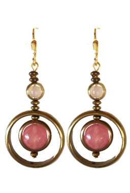 Mod arrangement of brass hoops with faceted new jade pink and pale pink glass accent beads on 22K vermeil lever back earring fixtures.