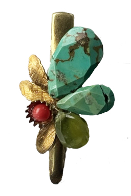 Sturdy antiqued brass alligator clip that tightly holds a swath of hair well-with an array of Chinese turquoise with olive chalcedony gemstones with vintage glass and brass findings.