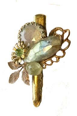 Sturdy antiqued brass alligator clip that tightly holds a swath of hair well-with an array of labradorite and prehnite gemstones and vintage glass with vintage brass findings.