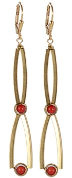 Super light weight modern deco long brass swaying with encased coral beads in brass rings on 22K vermeil lever back earring fixtures. 2.5"L x .25W