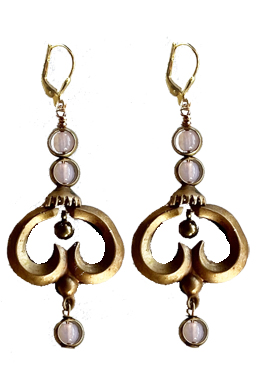 Casually elegant mix of brass findings and freshwater champagne colored pearl and pale pink glass beads on 22K vermeil lever back earring fixtures for secure wearing.