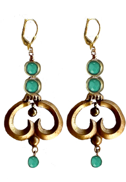 Casually elegant mix of brass findings and facteted Chinese turquoise beads on 22K vermeil lever back earring fixtures for secure wearing.