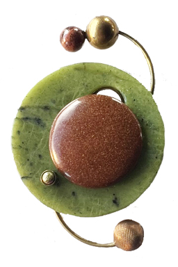Mod design made with African jade base with a goldstone cabouchon and red jasper and 1960's brass beads and hoops.