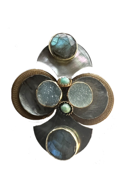 Classic deco design made with black lip mother of pearl with druzy and labradorite encased in 22K vermeil.