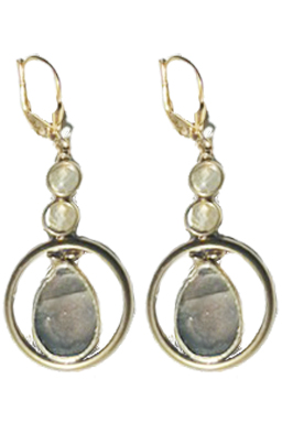 Labradorite slice encased in vermeil with faceted prehnite and brass rings on 22K vermeil lever back earring fixtures.
