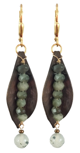 Vintage brass leaves with green tigereye beads and prehnite drops on 22K vermeil lever back earring backs. 1.25"L x .5"W