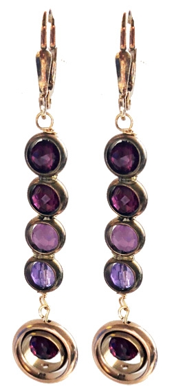 Elegant, delicate bejeweled earring with faceted garnet, ruby and amethyst beads encased in brass rings on 22K vermeil lever back earring fixtures. 2"L x .25"W