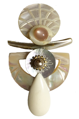 Carved vintage mother of pearl buttons and buckle with champagne freshwater pearl, vintage pale plastic pink cabouchon and bone teardrop finial on 3.5" french barrette fixture.