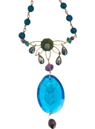 Long, light weight art nouveau inspired necklace on brass & teal dyed new jade chain with1930's peacock finish teardrop & amethyst beads dangling from 1930's & '50's glass & intaglio pendant embellished brass floral base. 20"L + 2" extender + 4" pendant (26" maximum total length)