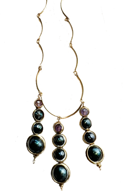 Faceted irridescent peacock colored dyed freshwater pearls and amethyst bead 'bubbles' dangle from fancy brass chain with a lobster claw clasp. 25" chain + 1.5" pendants with 2" extender.