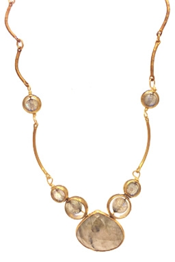 Classic deco arrangement of brass rings and labradorite beads on fancy brass chain with a vermeil bezeled labradorite center with 2" chain extender. 16.5"L + 2" extender