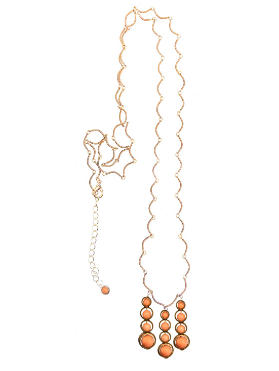 Pale coral 'bubbles' dangle from fancy brass chain with a lobster claw clasp. 25" chain + 1.5" pendants with 2" extender
