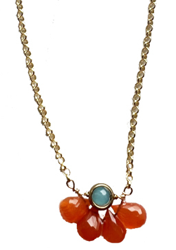 Faceted orange chalcedony petals with a blue/green new jade bead center make this small delicate floral inspired choker length necklace on fine 22K gold fill chain with a 2" extender chain.