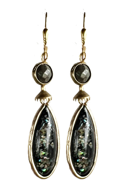 Opal looking lightweight resin stones in bezel setting accented by brass findings and faceted pyrite beads on 22K vermeil lever back earring fixtures.