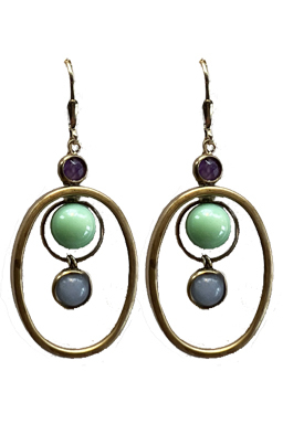 Mod design of oval and round brass rings with faceted amethyst, vintage mint green glass and angelite on 22K vermeil lever back earring fixtures.