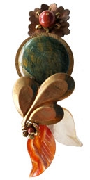 Earth tone mix of ryolite cabouchon, carnelian carved leaves, red jasper and vintage metal components on French barrette fixture. 4.5" x 1.25"W