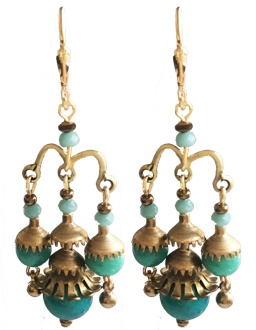 Byzantine shape with turquoise glass and brass chandelier-like drops on 22K vermeil lever back earring fixtures. 1.5"L x .66"W