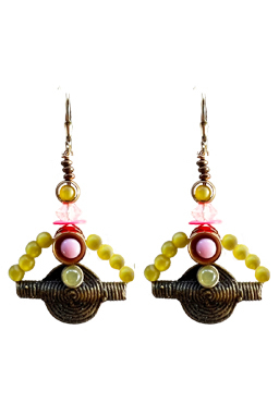 Modern tribal motif with African brass, vintage plastic, '30's-'50's glass accents on 22K vermeil lever back earring fixtures.