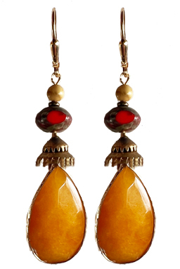 Dyed white jade bezelled butterscotch teardrops with jasper and fancy glass beads and brass caps with 22K vermeil lever back earring fixtures.