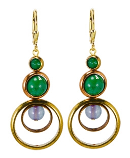 Mod arrangement of brass hoops surrounding turquoise green chrysoprase, green onyx and glass beads on 22K vermeil lever back earring fixtures. 2"L x 1.25"W