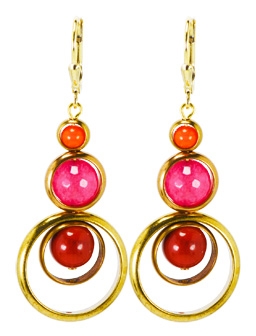 Mod arrangement of brass hoops surrounding faceted dyed pink new jade and smooth coral beads on 22K vermeil lever back earring fixtures. 2"L x 1.25"W
