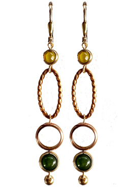Elegant shoulder duster with vintage and new brass hoops with faceted Korean and peking jade beads on 22K vermeil lever back earring fixtures.
